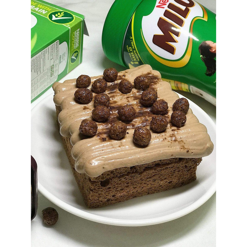 Cắt bánh ra làm 3 phần. Pha 1g cà phê với nước nóng sau đó phết dung dịch này lên bánh và phủ kem milo lên. Đặt lát bánh thứ 2 lên, phủ kem và đặt lát bánh thứ 3 lên. Cuối cùng phủ kín bánh bằng kem Milo và để ngăn mát 1 tiếng.